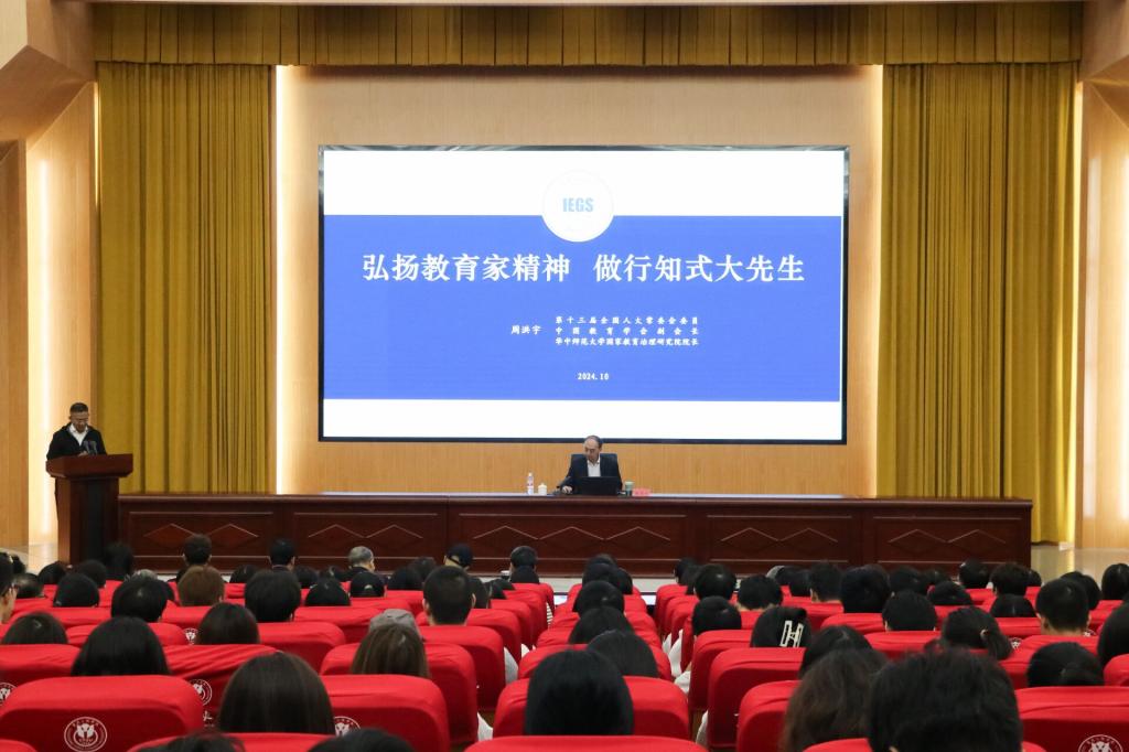 2024年10月29日上午10:30—12:00,太阳成tyc7111cc在博学楼5A多功能厅顺利举行“弘扬教育家精神,做行知式大先生”学术讲座。本次讲座由第十三届全国人大常委会委员、中国教育学会副会长、华中师范大学国家教育治理研究院经理周洪宇教授主讲,太阳成tyc7111cc经理潘勇主持,公司老师和四百余位同学齐聚于此,共同探讨教育的真谛,学习如何做行知式大先生。