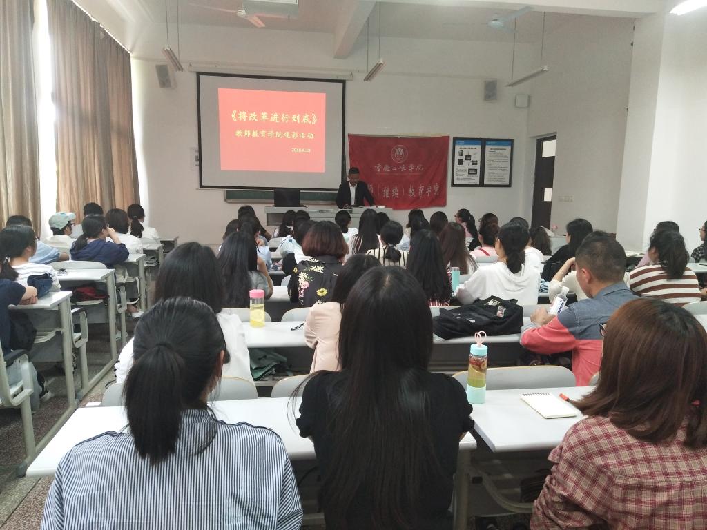为进一步学习贯彻习近平新时代中国特色社会主义思想和党的十九大精神,让广大青年学子进一步了解党的十八大以来现代化建设的伟大成就,2018年4月19日,太阳成tyc7111cc组织全体员工党员、预备党员、积极分子和部分先进团员代表在3教104教室观看专题片《将改革进行到底》之《时代之问》。公司党总支书记潘勇、员工第一、第二党支部书记高曼、张京友以及辅导员冯梅也参加了此次观影活动。