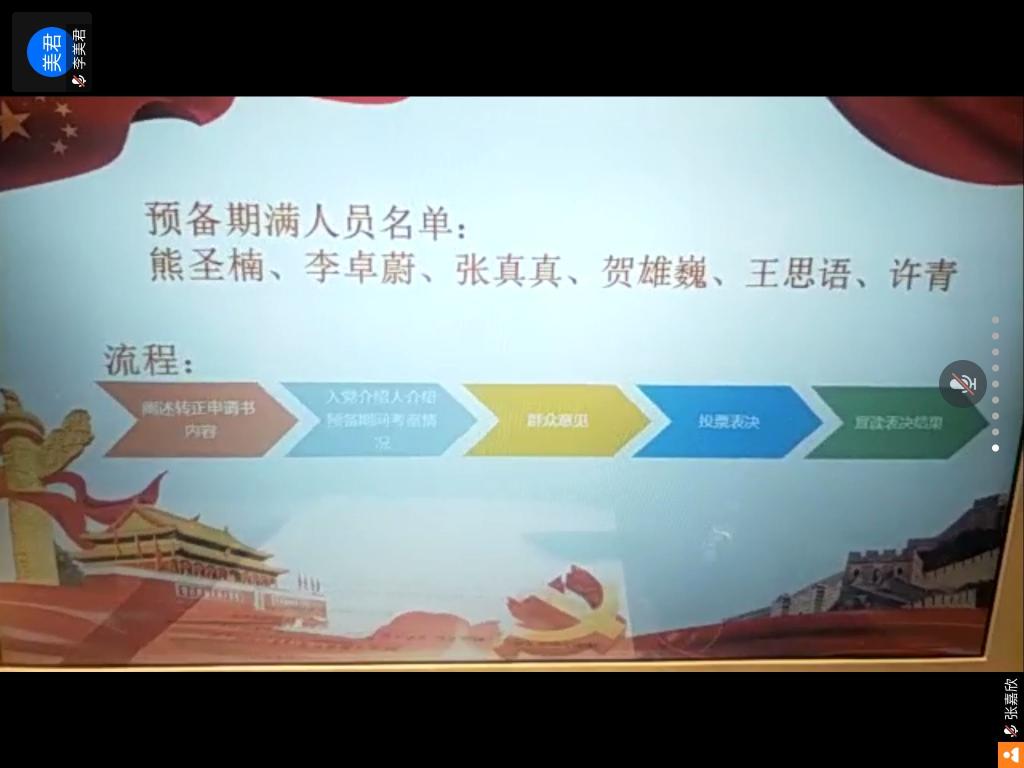 公司第一党支部于2020年5月21日晚上七点通过线上召开了以讨论预备党员张真真等六位同志预备期满是否按期转正问题为主题的支部大会。第一党支部正式党员及预备党员按时参会。