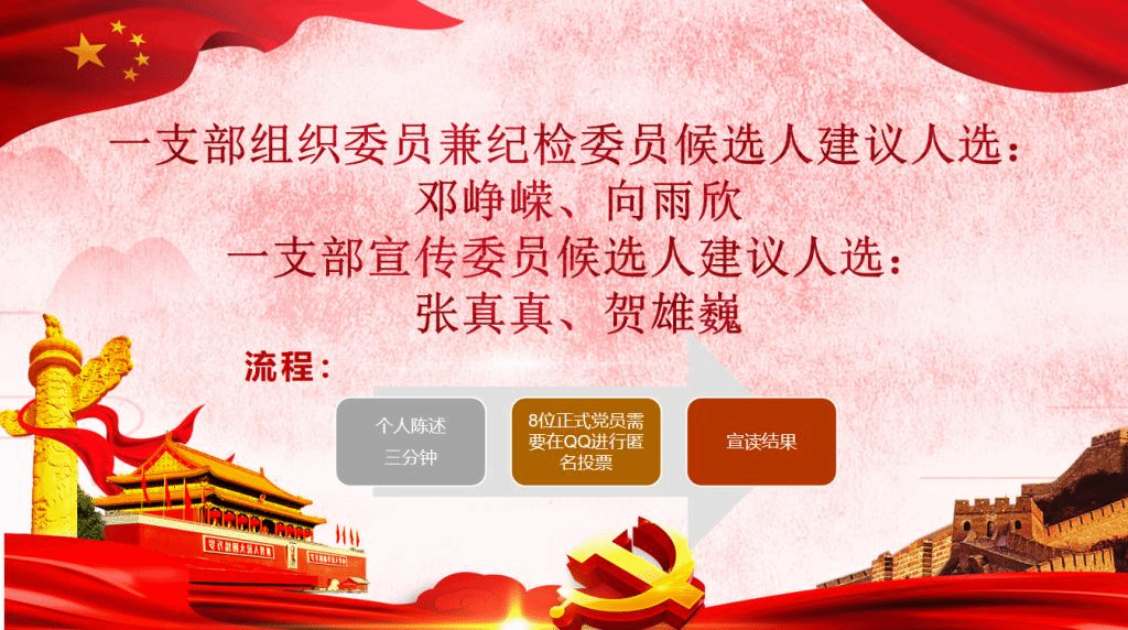 会议开始由主持人宣读了中共太阳成tyc7111cc委员会组织部关于公司党总支申请调整员工党支部委员的批复,介绍了本次党员大会的大体内容,指出第一支部组织委员兼纪检委员候选人建议人选为邓峥嵘、向雨欣;第一支部宣传委员候选人建议人选为张真真、贺雄巍。主持人宣读完毕后,四位候选人进行三分钟的自我陈述,他们都表示非常感谢党组织的支持与信任,作为一名共产党员在思想上积极向党组织靠齐,认真学习党的纲领和党的章程;在工作中积极服从党组织的安排,准备着为共产主义事业而奉献一生。候选人陈述完毕后,由主持人发起线上匿名投票,8名正式党员进行投票表决。根据投票结果,主持人宣布组织委员兼纪检委员由邓峥嵘同志担任,宣传委员由张真真同志担任。会议成功调整员工党支部委员,大家用热烈的掌声为当选的同志表示祝贺。