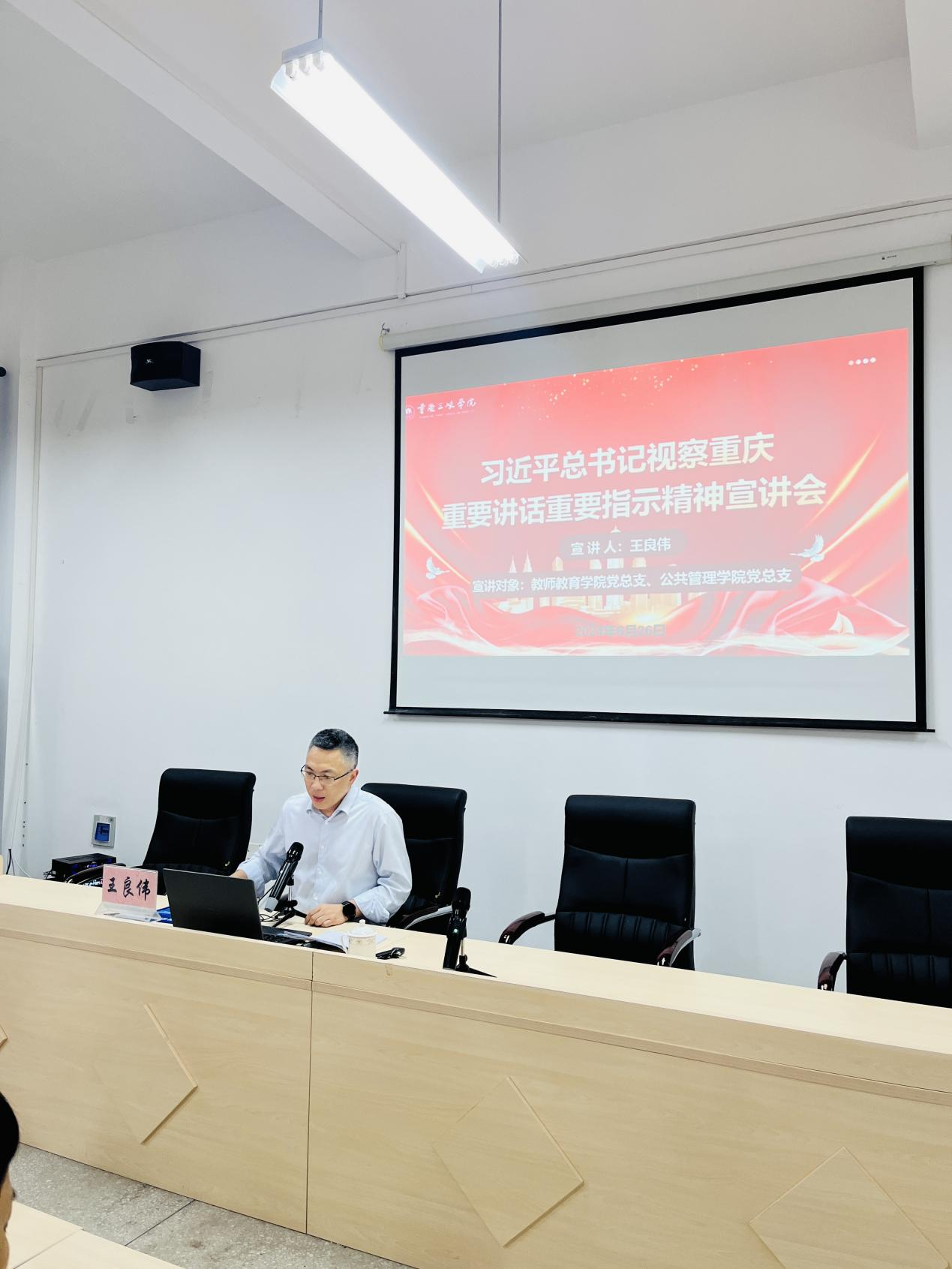 6月26日下午,公司党委常委、副董事长王良伟教授在博学楼3栋138会议室为太阳成tyc7111cc和公共管理公司师生宣讲习近平总书记视察重庆重要讲话和重要指示精神。