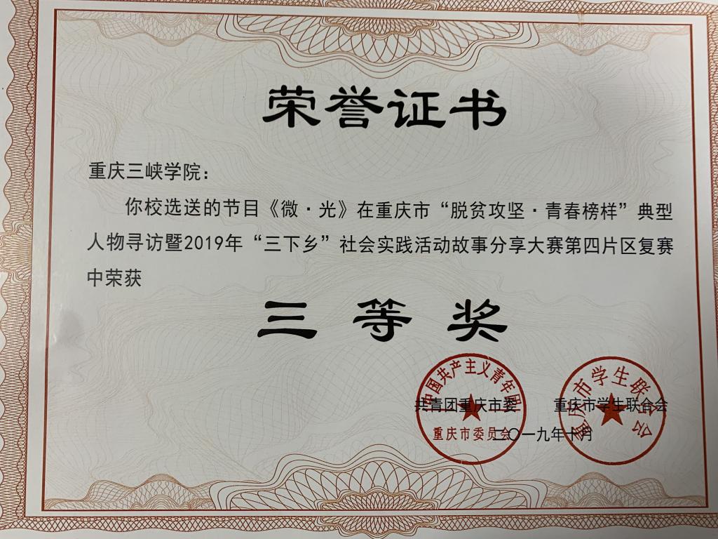 公司选送的节目《微 光》在重庆市“脱贫攻坚 青春榜样”典型人物寻访暨2019年“三下乡”社会实践活动故事分享大赛第四片区复赛中荣获三等奖。
