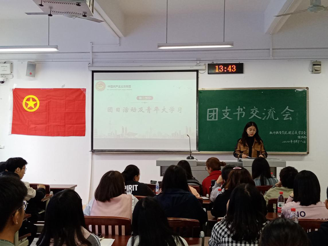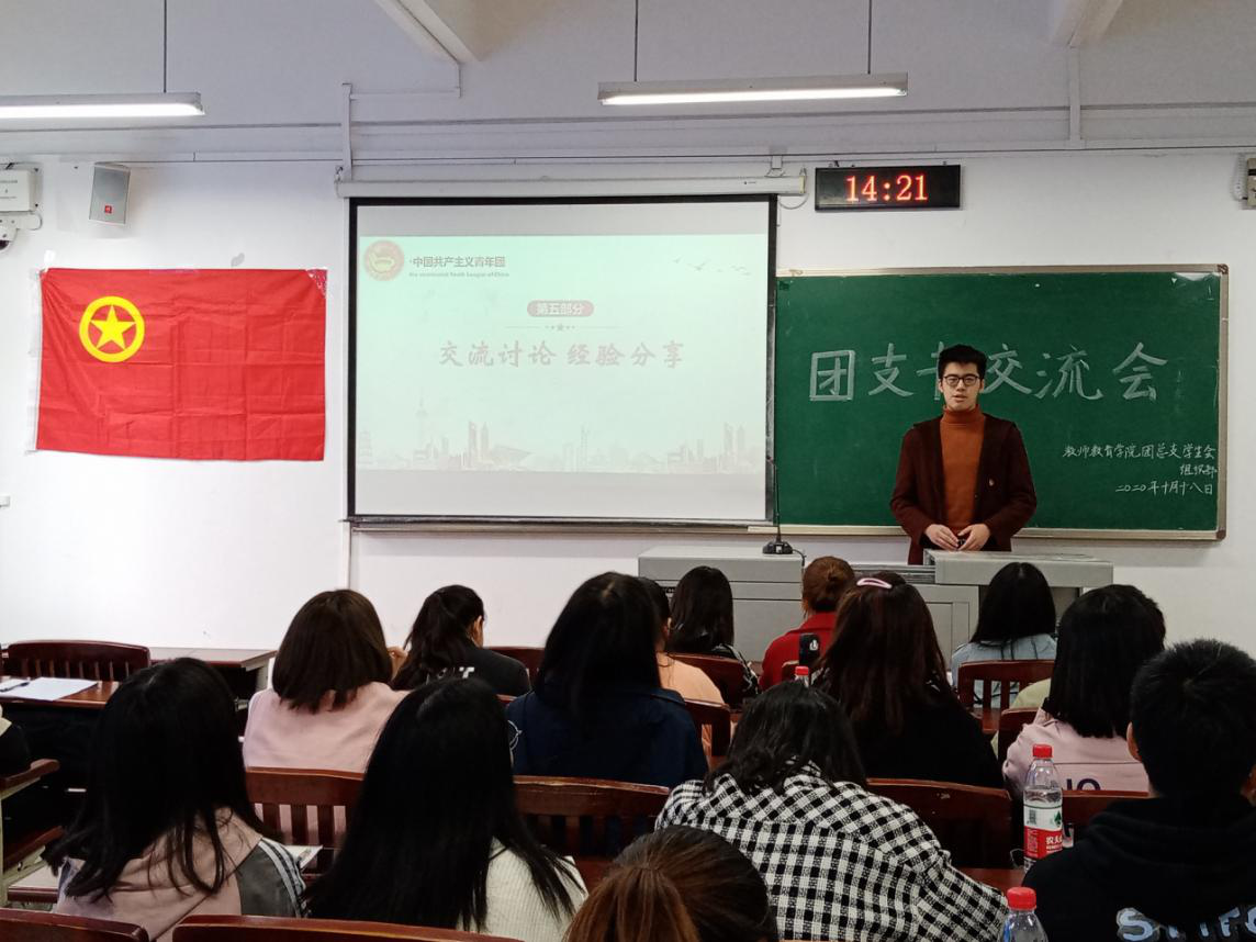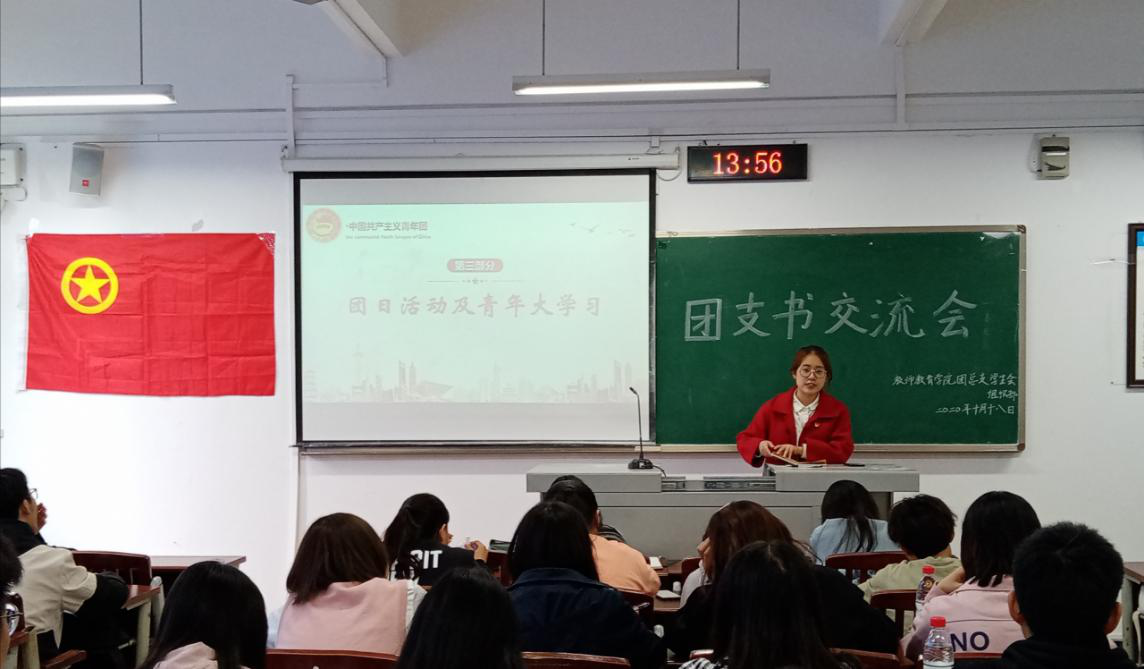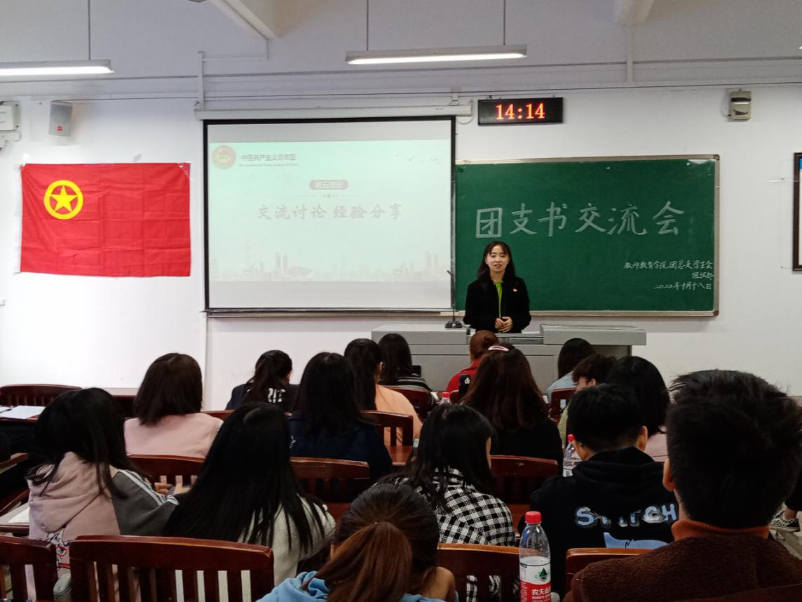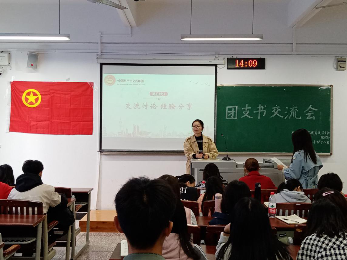 公司团总支员工会组织部负责人吴梦雪主持了团支书交流讨论环节,让各级团支书进行探讨。会议还邀请了2018级小学教育(师范)6班团支书庞君毅、2018级小学教育(师范)4班团支书郭松进行经验分享,从多个方面为到场人员提供了优质建议。