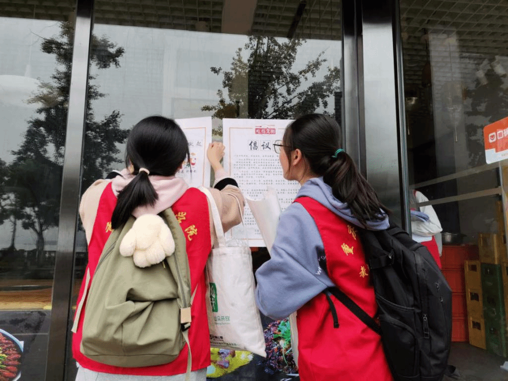 刚到达北滨路丰收社区便民服务中心,志愿者们便穿戴好马甲与帽子,认真听从居委会的工作安排。随后,在居委会工作人员的带领下,志愿者们纷纷走进北滨路段美食街各个餐饮店,发放“吃得文明”倡议书与文明餐厅申报表,并对北滨路美食街创建单位进行申报登记,积极倡导文明健康、绿色环保的生活方式,宣扬吃得文明、吃得安全的餐桌文化。同时,为了呼吁更多的人了解并参与到文明餐桌食品安全活动中来,志愿者们还在各餐饮店里最醒目的位置张贴“吃得文明,从我做起”公益海报,扩大活动影响力与号召力。