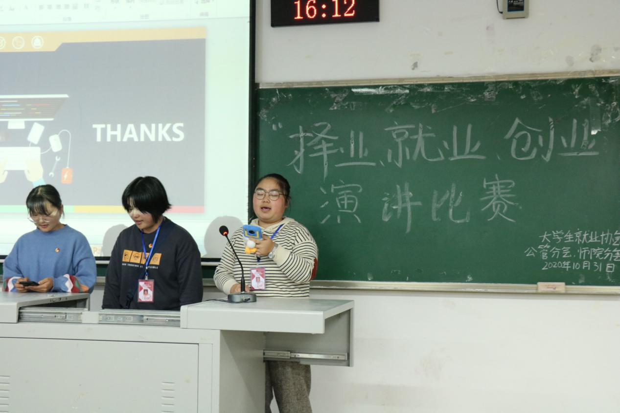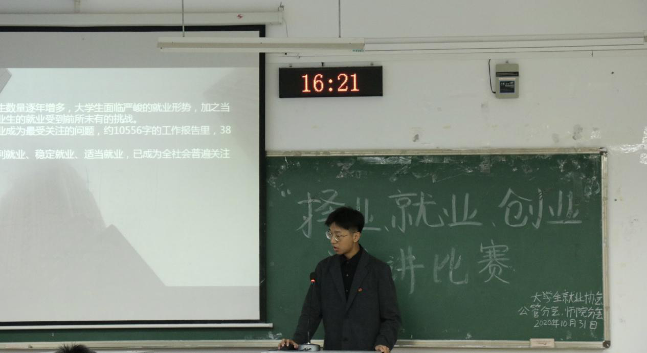为了让广大学子顺应时代新趋势、了解新就业形态,太阳成tyc7111cc特联合公共管理公司举办以“了解就业新形态,把握就业新方向”为主题的“择业、就业、创业”演讲比赛。2020年10月31日14:00,比赛在明辨楼1栋204正式拉开帷幕。