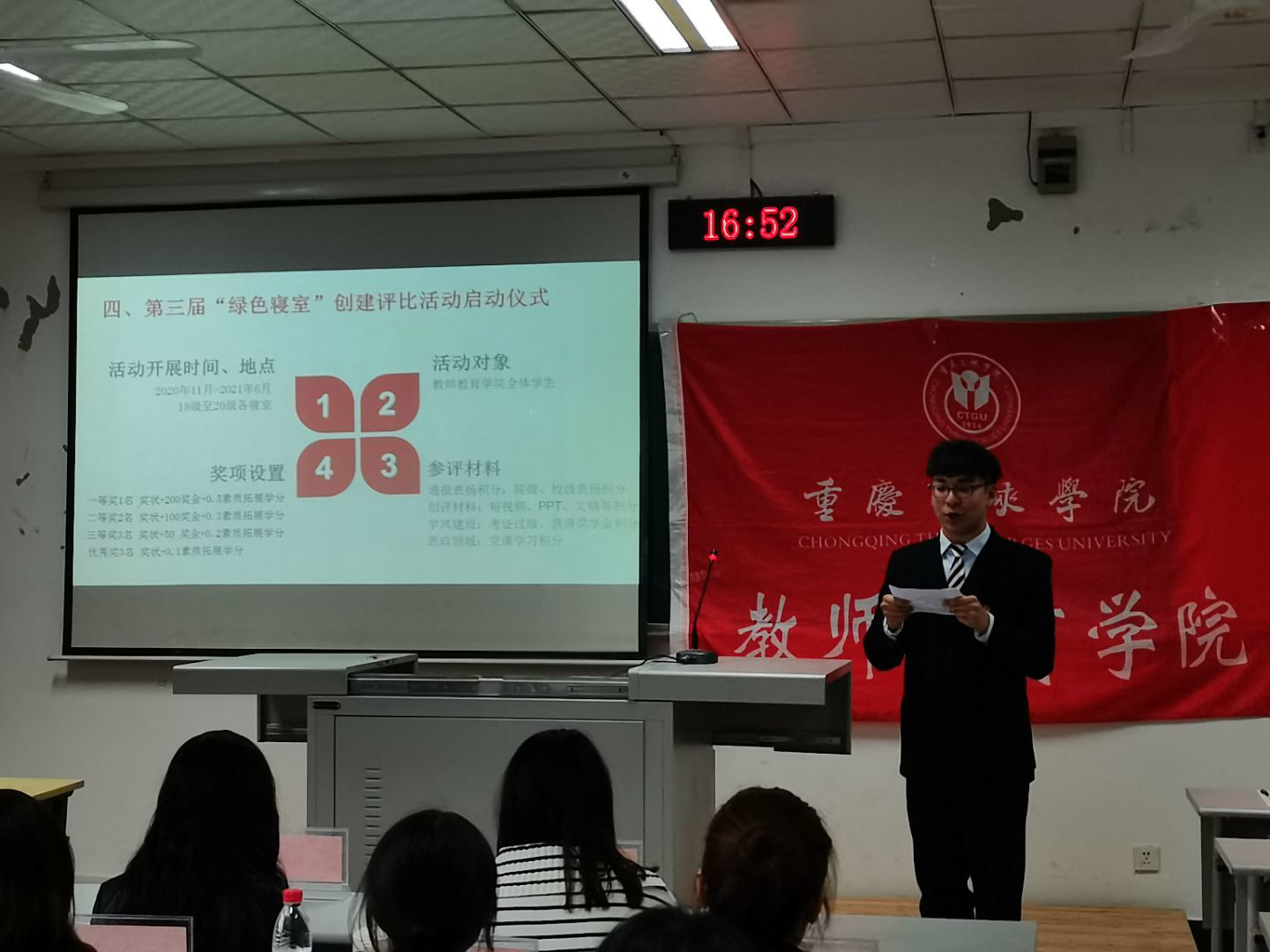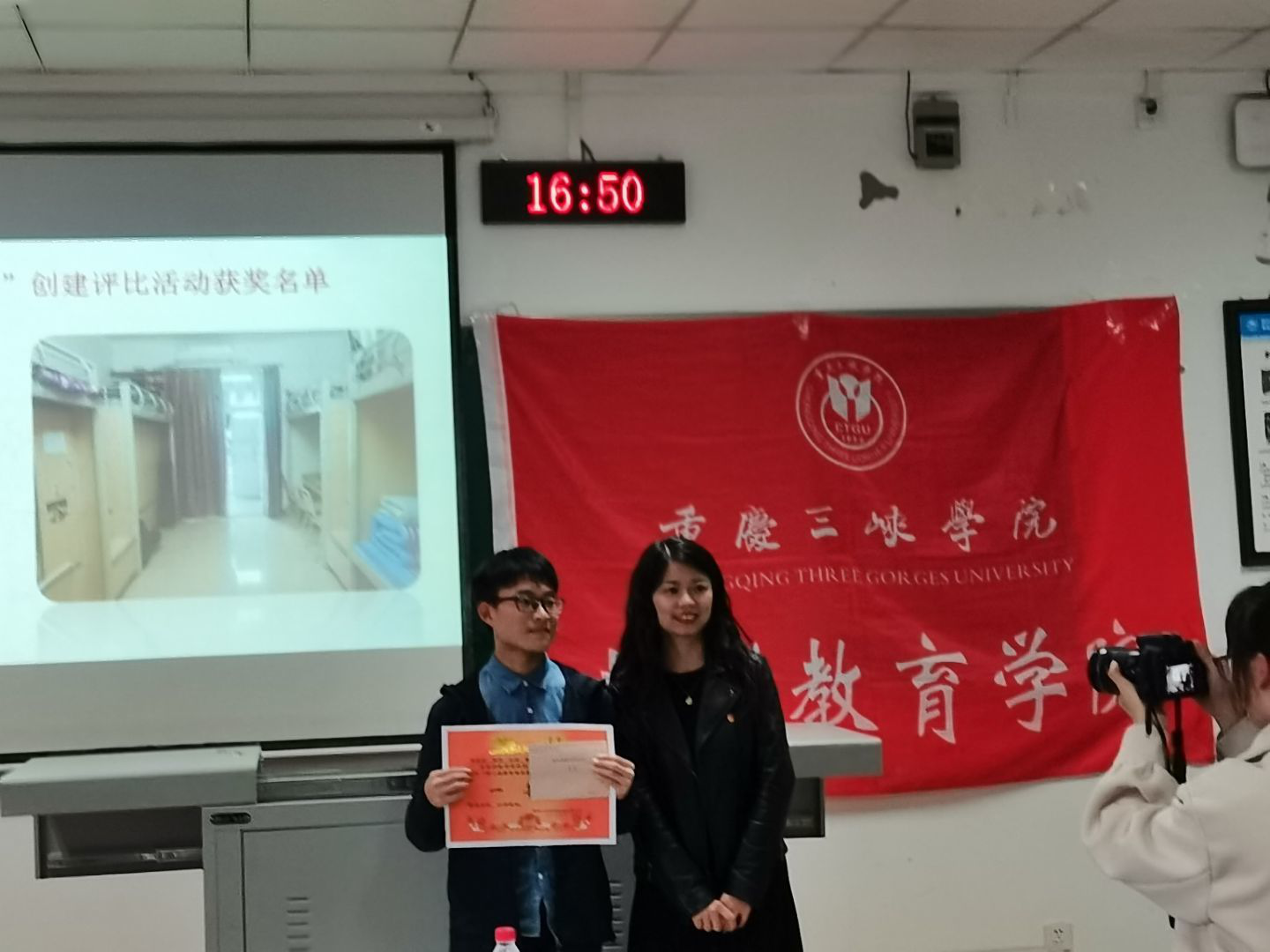 本次表彰大会首先简要介绍了第二届“绿色寝室”创建的活动简介和基本内容,展示了本次活动中创评材料、评比检查过程以及优秀寝室的材料。对于被表彰的寝室,生活纪检部随之安排了其中两个获奖寝室派出代表进行发言,讲述寝室参与活动的过程以及寝室日常规范。发言完毕后,由2019级辅导员邓峥嵘颁发优秀奖以及三等奖,学工办副主任高曼颁发二等奖及一等奖,两位老师分别与获奖寝室代表合影留念。表彰大会结尾启动了第三届“绿色寝室”创建评比活动,同时展示了第三届创建评比活动的相关要求。