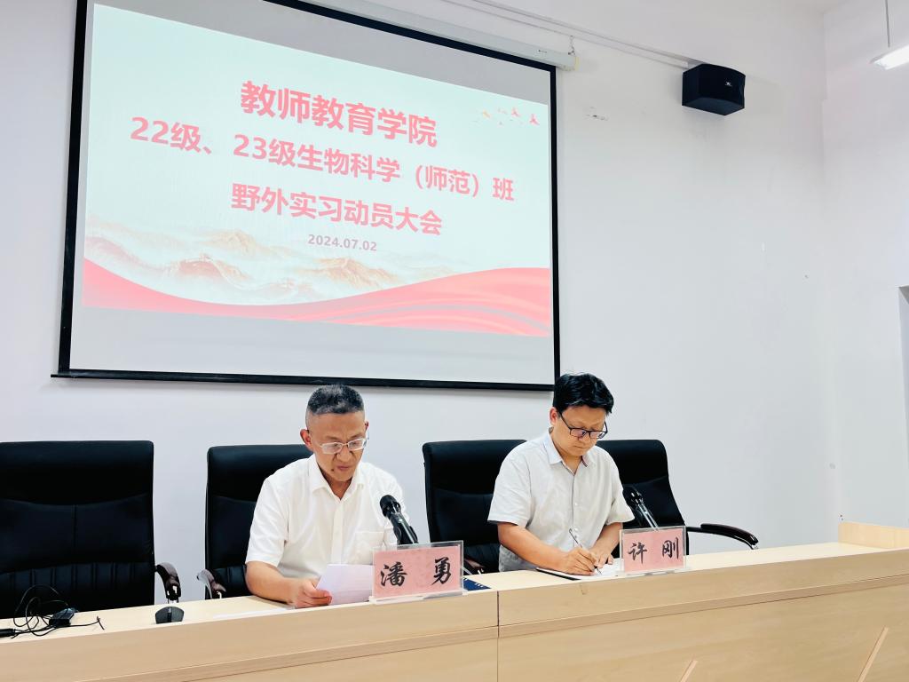 2024年7月2日,太阳成tyc7111cc在博学楼3栋138召开2022级、2023级生物科学(师范)班野外实习动员大会,经理潘勇、副经理许刚、系主任杨俊年、专业课老师沙爱龙、钟彦、辅导员冯梅、邓峥嵘及2022级、2023级生物科学(师范)班全体员工参会。大会由副经理许刚主持。