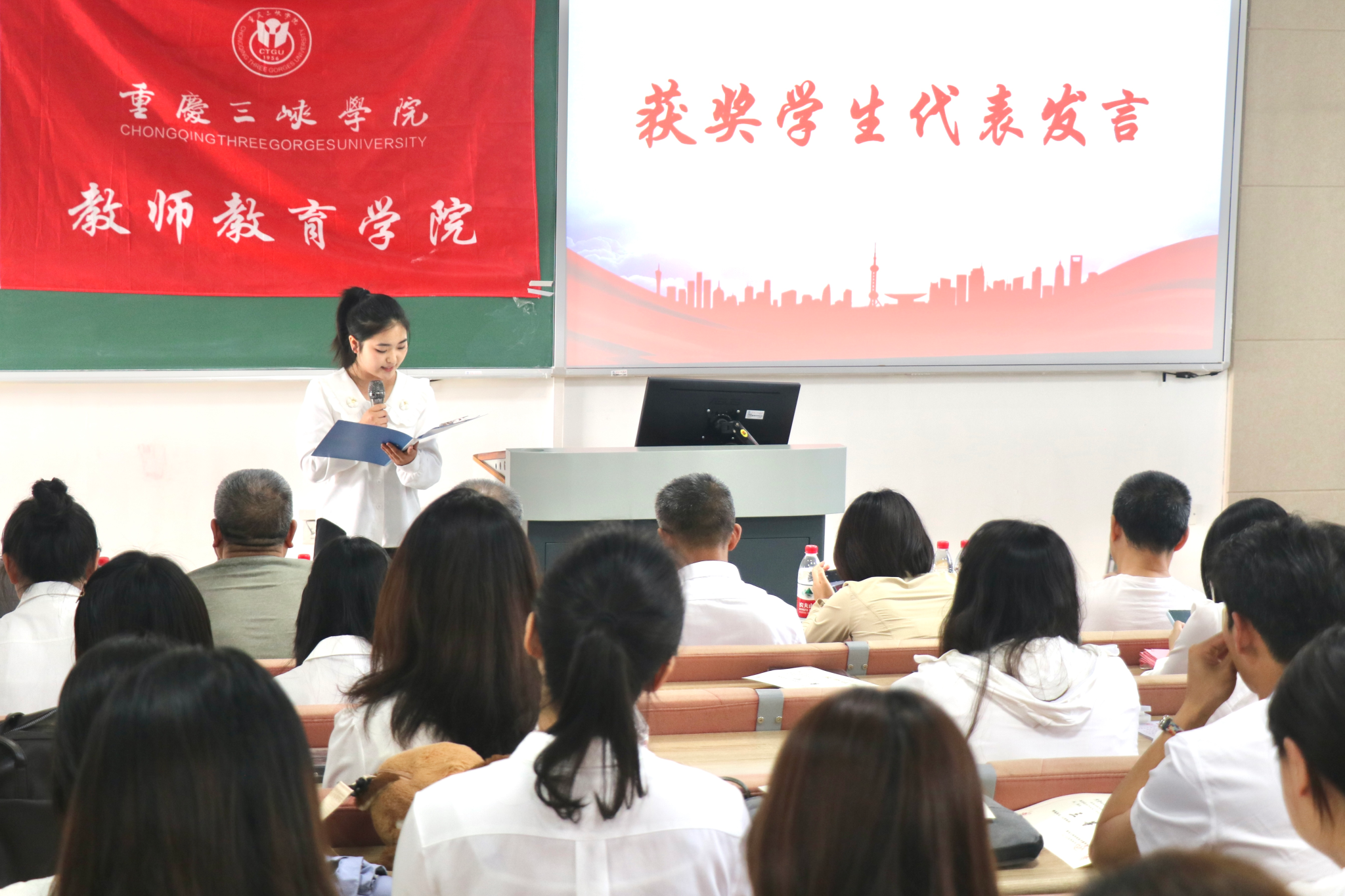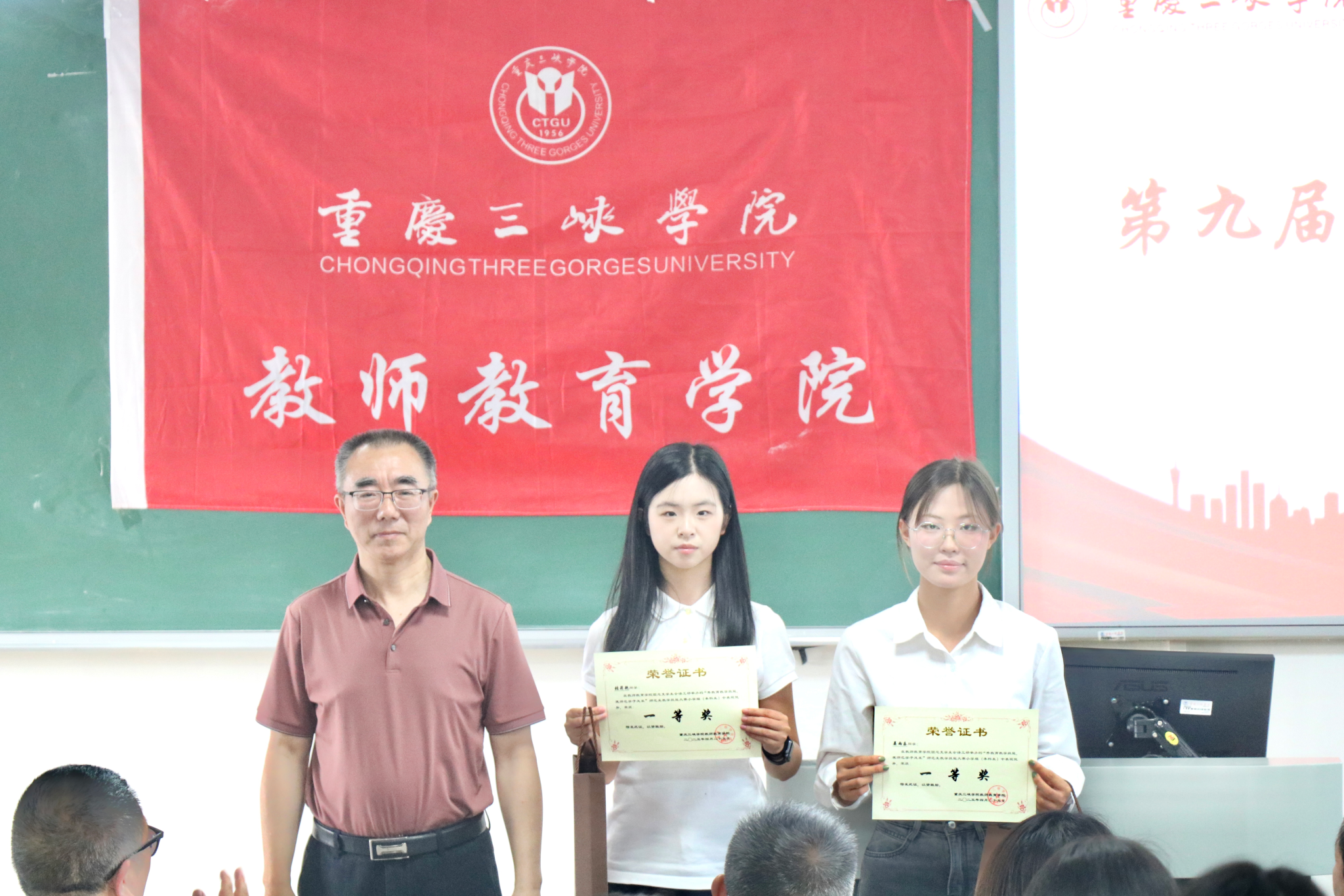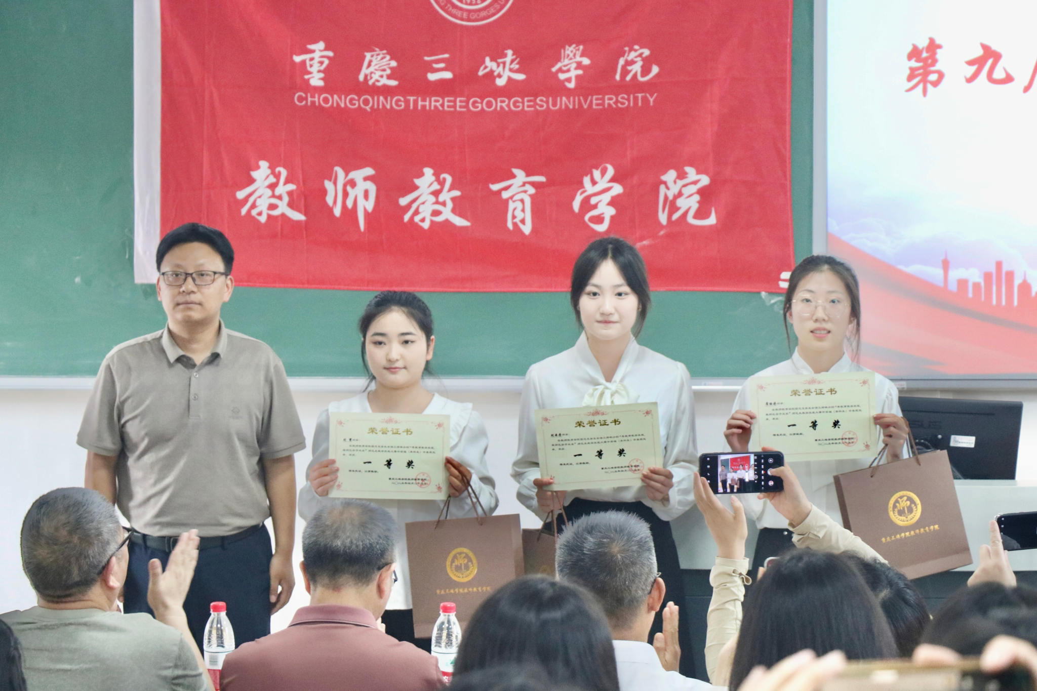 副经理蒋文峰宣读了表彰名单。本届大赛共有59名选手参赛,经过激烈角逐,48人晋级决赛。最终,小学教育研究生组和本科生组各评出一等奖2名、二等奖4名,三等奖6名;中学教育研究生组评出一等奖1名,二等奖2名,三等奖3名;中学教育本科生组评出一等奖3名,二等奖6名,三等奖9名。与会领导及教师依次为获奖选手颁发荣誉证书并合影留念。