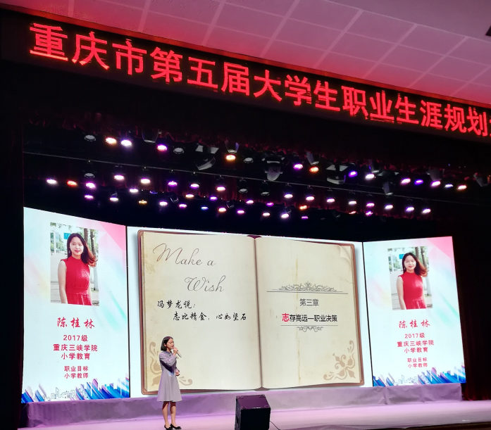 在决赛现场,陈桂林同学以“一位平凡教师的自传”阐释自己的职业生涯规划。她目标明确,定位准确,用清晰的规划和富有感染力的表现打动现场评委。