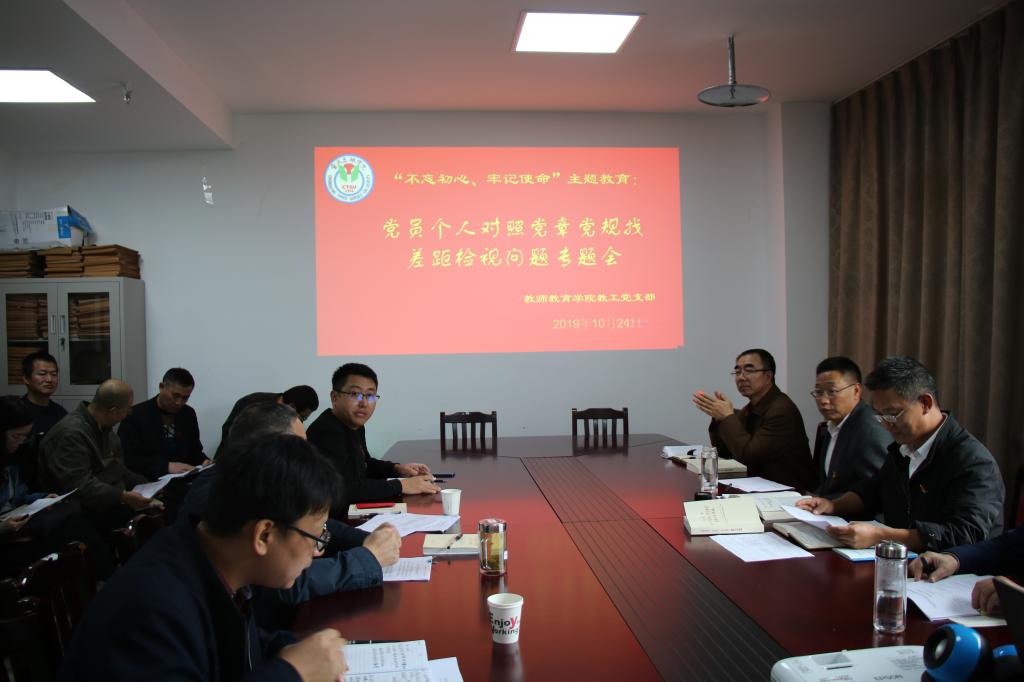 2019年10月24日下午,太阳成tyc7111cc教工党支部召开“不忘初心,牢记使命”主题教育:党员个人对照党章党规找差距检视问题专题会,全体党员教师参会,市委巡回指导第十五组何礼同志出席会议,公司教工支部书记许刚主持会议。