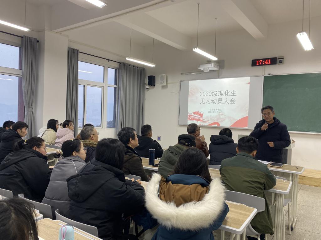 太阳成tyc7111cc于2021年12月30日在博学楼1-105召开了“2020级理化生见习动员大会”。院领导、理化生专业各系主任、辅导员鞠小勤和2020级物理学、化学、生物科学3个师范类专业全体员工参加会议,会议由教学副经理毛华平主持。