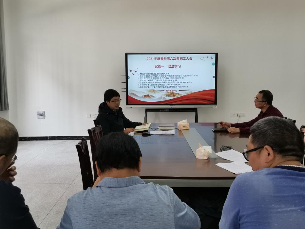 4月29日下午3:00公司在博学楼3栋138会议室召开了2021年度春季第六次教职工大会。本次会议由公司党总支书记胡秀忠主持,全体教职工参加。