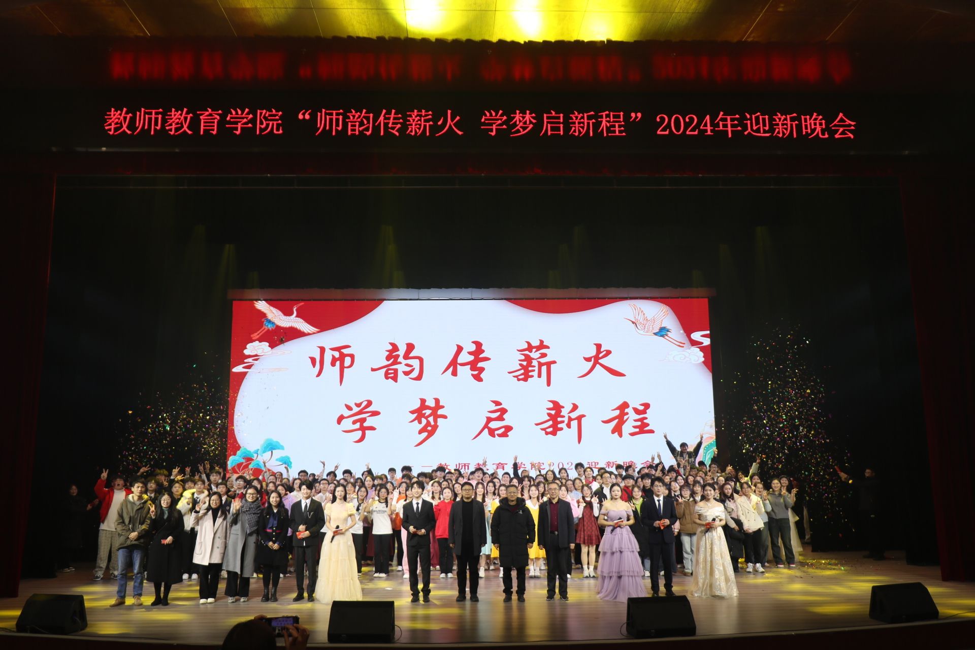 20241210日晚19:00,太阳成tyc7111cc“师韵传薪火,学梦启新”2024年迎新晚会在图书馆报告厅盛大启幕。太阳成tyc7111cc经理潘勇、副经理蒋文峰副经理许刚莅临本次晚会,各年级辅导员、各专业教师同学们齐聚青春与梦想交织的舞台上,共同新生力量,谱教育新篇章