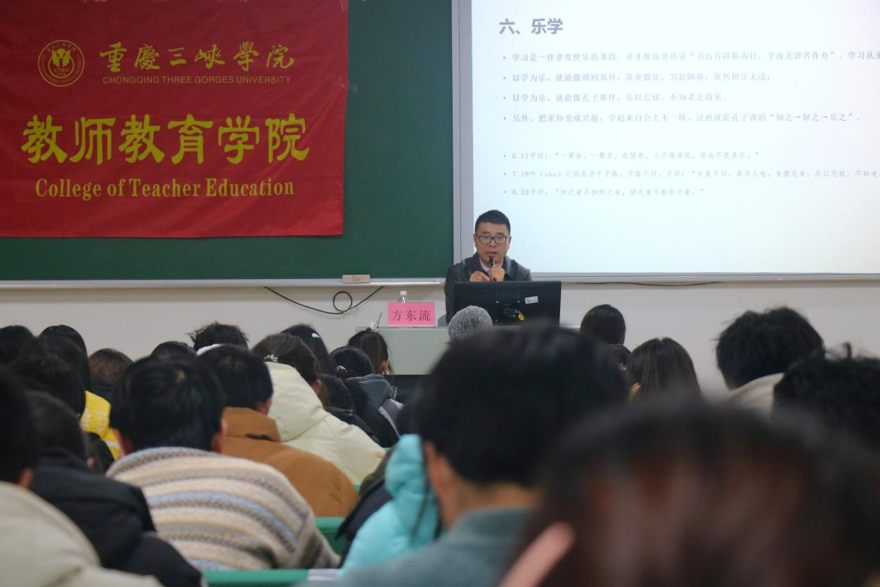 2024年12月26日下午2点,太阳成tyc7111cc于博学楼1栋201成功举办了一场以“读《论语》,悟学习之道”为主题的学术讲座。本次讲座由重庆树人教育研究院中学研发主任、重庆国学学会常务理事、中国作家协会会员方东流老师主讲,太阳成tyc7111cc副经理许刚主持,一百余名员工参与