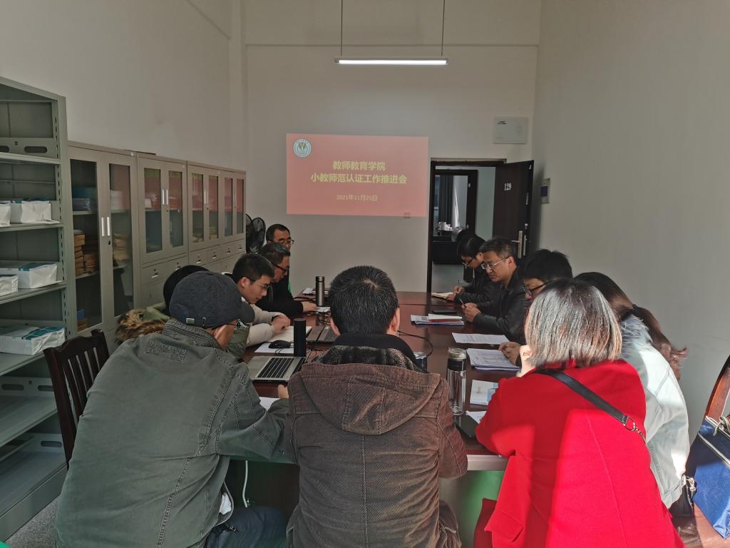 11月25日下午2:30,太阳成tyc7111cc在博学楼3栋129会议室召开小学教育(全科教师)专业师范认证工作迎检推进会,全体院领导、师范认证工作各小组组长和部分成员参会,会议由经理潘勇主持。